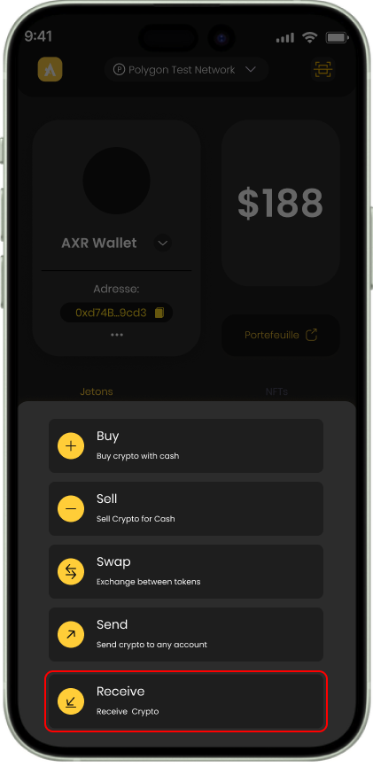 To receive fund you need to log-in to your wallet using your valid credentials. Once logged in, on the dashboard go to the AXR token, and here you can see “Receive” button.